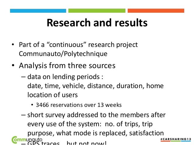 12. 12. Research and results • Part of a “continuous” research project Communauto/Polytechnique • Analysis from three sources – data on lending periods : date, time, vehicle, distance, duration, home location of users • 3466 reservations over 13 weeks – short survey addressed to the members after every use of the system: no. of trips, trip purpose, what mode is replaced, satisfaction