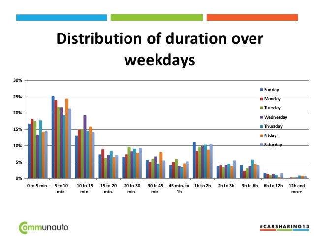 16. 16. Distribution of duration over weekdays 0% 5% 10% 15% 20% 25% 30% 0 to 5 min. 5 to 10 min. 10 to 15 min. 15 to 20 min. 20 to 30 min. 30 to 45 min. 45 min. to 1h 1h to 2h 2h to 3h 3h to 6h 6h to 12h 12h and more Sunday Monday Tuesday Wednesday Thursday Friday Saturday