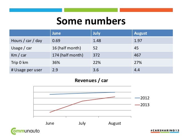 22. 22. Some numbers June July August Hours / car / day 0.69 1.48 1.97 Usage / car 16 (half month) 52 45 Km / car 174 (half month) 372 467 Trip 0 km 36% 22% 27% # Usage per user 2.9 3.6 4.4 June July August Revenues / car 2012 2013