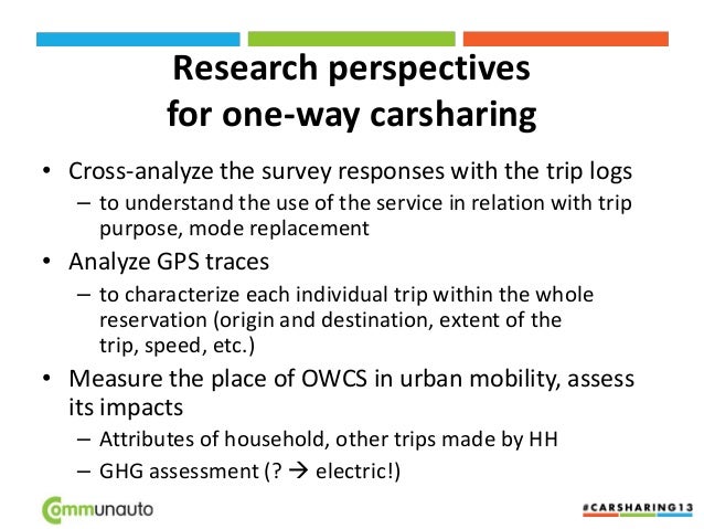 23. 23. Research perspectives for one-way carsharing • Cross-analyze the survey responses with the trip logs – to understand the use of the service in relation with trip purpose, mode replacement • Analyze GPS traces – to characterize each individual trip within the whole reservation (origin and destination, extent of the trip, speed, etc.) • Measure the place of OWCS in urban mobility, assess its impacts – Attributes of household, other trips made by HH – GHG assessment (?  electric!)