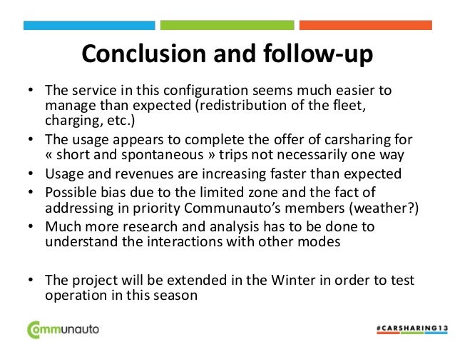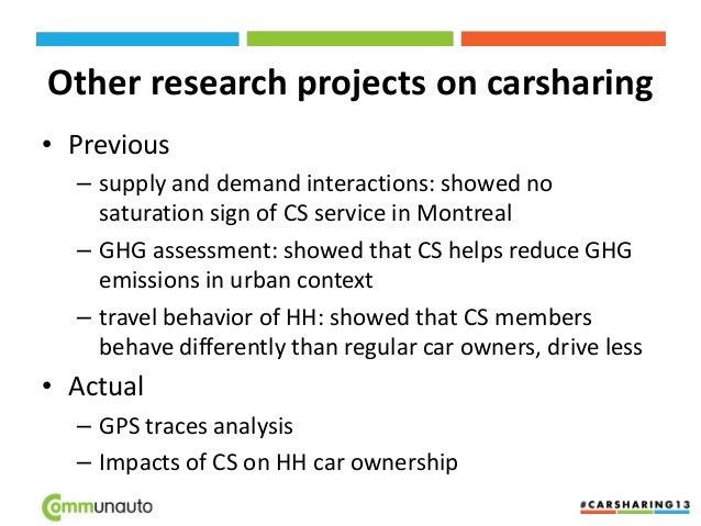 26. 26. Other research projects on carsharing • Previous – supply and demand interactions: showed no saturation sign of CS service in Montreal – GHG assessment: showed that CS helps reduce GHG emissions in urban context – travel behavior of HH: showed that CS members behave differently than regular car owners, drive less • Actual – GPS traces analysis – Impacts of CS on HH car ownership