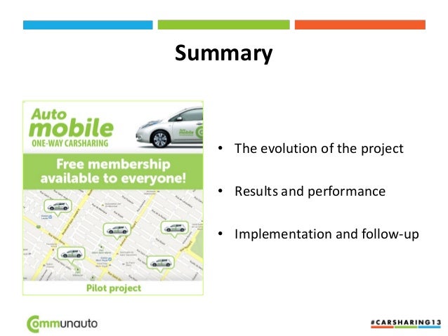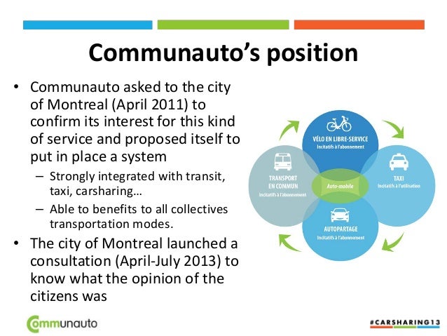 6. 6. Communauto’s position • Communauto asked to the city of Montreal (April 2011) to confirm its interest for this kind of service and proposed itself to put in place a system – Strongly integrated with transit, taxi, carsharing… – Able to benefits to all collectives transportation modes. • The city of Montreal launched a consultation (April-July 2013) to know what the opinion of the citizens was