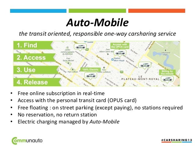 7. 7. Auto-Mobile the transit oriented, responsible one-way carsharing service • Free online subscription in real-time • Access with the personal transit card (OPUS card) • Free floating : on street parking (except paying), no stations required • No reservation, no return station • Electric charging managed by Auto-Mobile