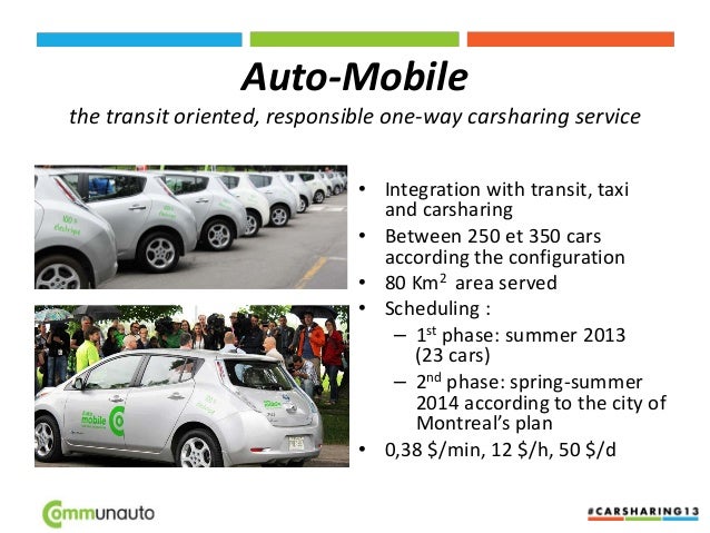 8. 8. Auto-Mobile the transit oriented, responsible one-way carsharing service • Integration with transit, taxi and carsharing • Between 250 et 350 cars according the configuration • 80 Km2 area served • Scheduling : – 1st phase: summer 2013 (23 cars) – 2nd phase: spring-summer 2014 according to the city of Montreal’s plan • 0,38 $/min, 12 $/h, 50 $/d