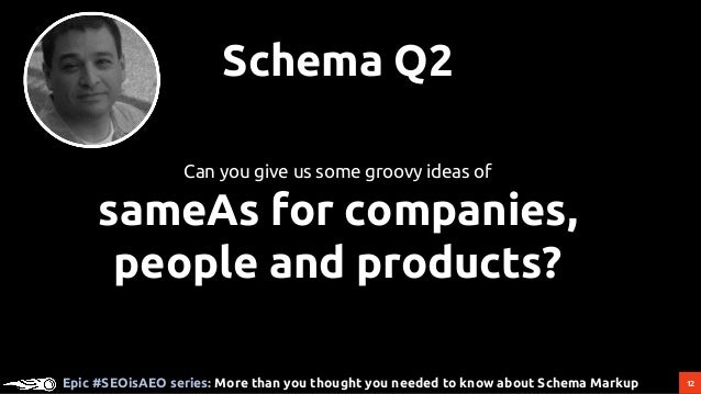 12. 12. 12Epic #SEOisAEO series: More than you thought you needed to know about Schema Markup Schema Q2 Can you give us some groovy ideas of sameAs for companies, people and products?