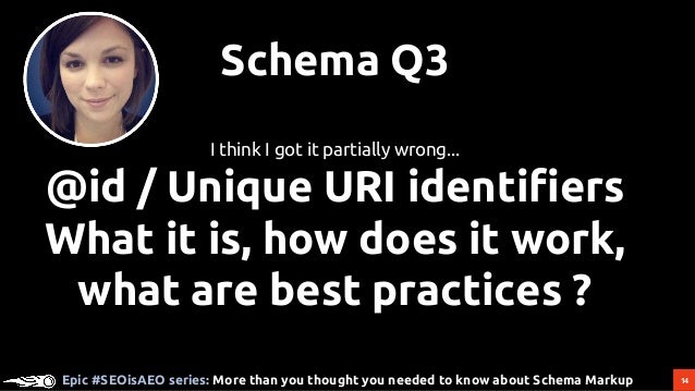 14. 14. 14Epic #SEOisAEO series: More than you thought you needed to know about Schema Markup Schema Q3 I think I got it partially wrong... @id / Unique URI identifiers What it is, how does it work, what are best practices ?