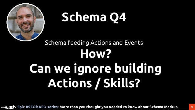16. 16. 16Epic #SEOisAEO series: More than you thought you needed to know about Schema Markup Schema Q4 Schema feeding Actions and Events How? Can we ignore building Actions / Skills?