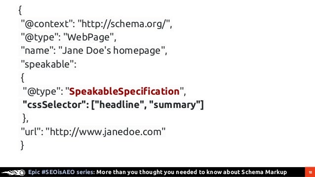 18. 18. 18Epic #SEOisAEO series: More than you thought you needed to know about Schema Markup { "@context": "http://schema.org/", "@type": "WebPage", "name": "Jane Doe's homepage", "speakable": { "@type": "SpeakableSpecification", "cssSelector": ["headline", "summary"] }, "url": "http://www.janedoe.com" }