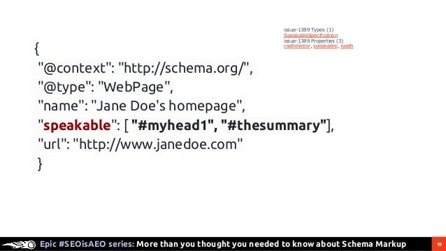 19. 19. 19Epic #SEOisAEO series: More than you thought you needed to know about Schema Markup { "@context": "http://schema.org/", "@type": "WebPage", "name": "Jane Doe's homepage", "speakable": [ "#myhead1", "#thesummary"], "url": "http://www.janedoe.com" } issue-1389 Types (1) SpeakableSpecification issue-1389 Properties (3) cssSelector, speakable, xpath