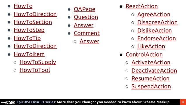 20. 20. 20Epic #SEOisAEO series: More than you thought you needed to know about Schema Markup ● HowTo ● HowToDirection ● HowToSection ● HowToStep ● HowToTip ● HowToDirection ● HowToItem ○ HowToSupply ○ HowToTool ● ReactAction ○ AgreeAction ○ DisagreeAction ○ DislikeAction ○ EndorseAction ○ LikeAction ● ControlAction ○ ActivateAction ○ DeactivateAction ○ ResumeAction ○ SuspendAction ● QAPage ● Question ● Answer ● Comment ○ Answer