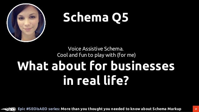 21. 21. 21Epic #SEOisAEO series: More than you thought you needed to know about Schema Markup Schema Q5 Voice Assistive Schema. Cool and fun to play with (for me) What about for businesses in real life?