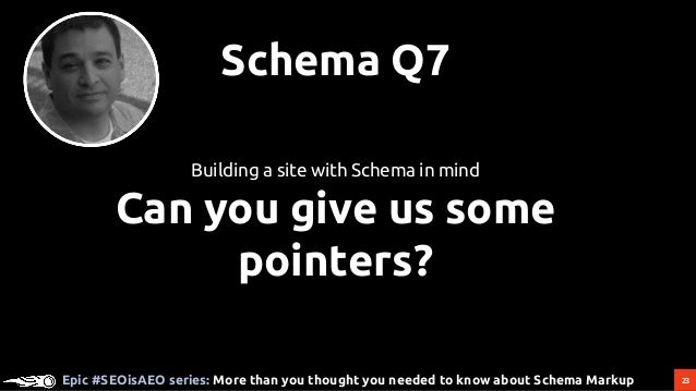 23. 23. 23Epic #SEOisAEO series: More than you thought you needed to know about Schema Markup Schema Q7 Building a site with Schema in mind Can you give us some pointers?