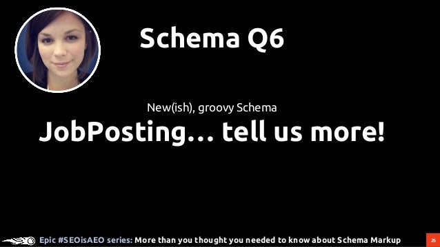 25. 25. 25Epic #SEOisAEO series: More than you thought you needed to know about Schema Markup Schema Q6 New(ish), groovy Schema JobPosting… tell us more!