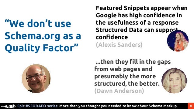 26. 26. 26Epic #SEOisAEO series: More than you thought you needed to know about Schema Markup “We don’t use Schema.org as a Quality Factor” Featured Snippets appear when Google has high confidence in the usefulness of a response Structured Data can support confidence (Alexis Sanders) ...then they fill in the gaps from web pages and presumably the more structured, the better. (Dawn Anderson)