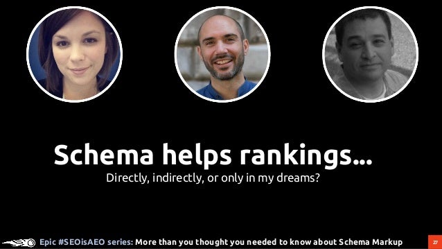 27. 27. 27Epic #SEOisAEO series: More than you thought you needed to know about Schema Markup Schema helps rankings... Directly, indirectly, or only in my dreams?