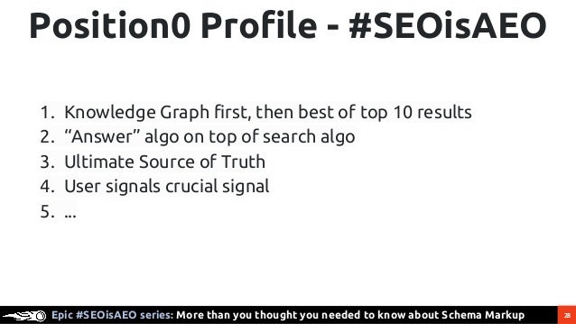 28. 28. 28Epic #SEOisAEO series: More than you thought you needed to know about Schema Markup 1. Knowledge Graph first, then best of top 10 results 2. “Answer” algo on top of search algo 3. Ultimate Source of Truth 4. User signals crucial signal 5. ... Position0 Profile - #SEOisAEO