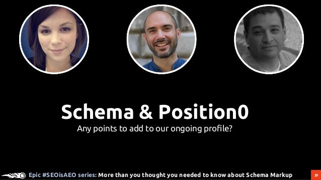 29. 29. 29Epic #SEOisAEO series: More than you thought you needed to know about Schema Markup Schema & Position0 Any points to add to our ongoing profile?