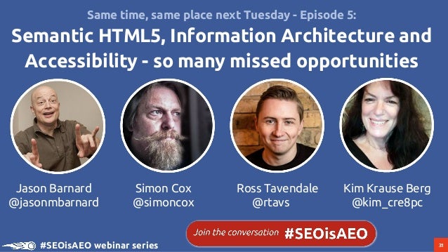 31. 31. 31#SEOisAEO webinar series Simon Cox @simoncox Ross Tavendale @rtavs Kim Krause Berg @kim_cre8pc Jason Barnard @jasonmbarnard Same time, same place next Tuesday - Episode 5: Semantic HTML5, Information Architecture and Accessibility - so many missed opportunities