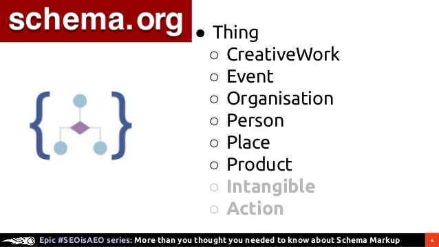 6. 6. 6Epic #SEOisAEO series: More than you thought you needed to know about Schema Markup ● Thing ○ CreativeWork ○ Event ○ Organisation ○ Person ○ Place ○ Product ○ Intangible ○ Action