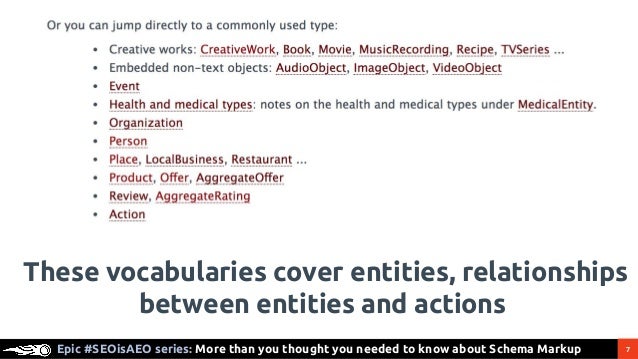7. 7. 7Epic #SEOisAEO series: More than you thought you needed to know about Schema Markup These vocabularies cover entities, relationships between entities and actions