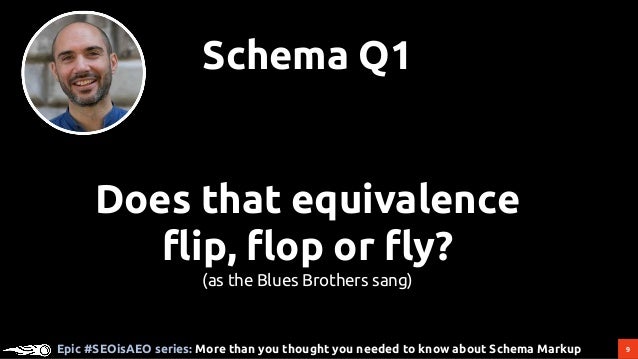 9. 9. 9Epic #SEOisAEO series: More than you thought you needed to know about Schema Markup Schema Q1 Does that equivalence flip, flop or fly? (as the Blues Brothers sang)