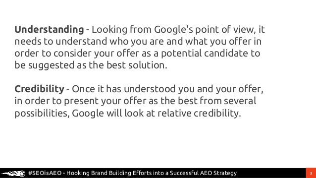 3. 3. 3#SEOisAEO - Hooking Brand Building Efforts into a Successful AEO Strategy Understanding - Looking from Google's point of view, it needs to understand who you are and what you offer in order to consider your offer as a potential candidate to be suggested as the best solution. Credibility - Once it has understood you and your offer, in order to present your offer as the best from several possibilities, Google will look at relative credibility.