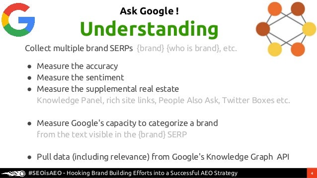 4. 4. 4#SEOisAEO - Hooking Brand Building Efforts into a Successful AEO Strategy Taking control of the presentation of your Brand by the engines Schema? Open Data Clouds? Press? Ask Google ! Understanding Collect multiple brand SERPs {brand} {who is brand}, etc. ● Measure the accuracy ● Measure the sentiment ● Measure the supplemental real estate Knowledge Panel, rich site links, People Also Ask, Twitter Boxes etc. ● Measure Google's capacity to categorize a brand from the text visible in the {brand} SERP ● Pull data (including relevance) from Google's Knowledge Graph API