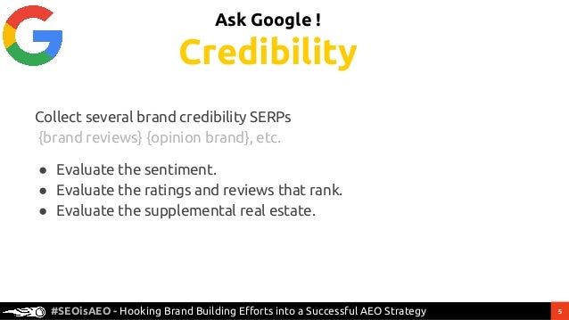 5. 5. 5#SEOisAEO - Hooking Brand Building Efforts into a Successful AEO Strategy Taking control of the presentation of your Brand by the engines Schema? Open Data Clouds? Press? Collect several brand credibility SERPs {brand reviews} {opinion brand}, etc. ● Evaluate the sentiment. ● Evaluate the ratings and reviews that rank. ● Evaluate the supplemental real estate. Ask Google ! Credibility