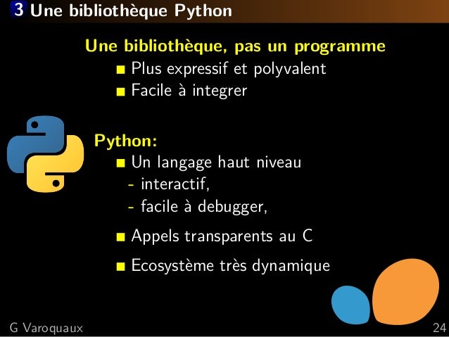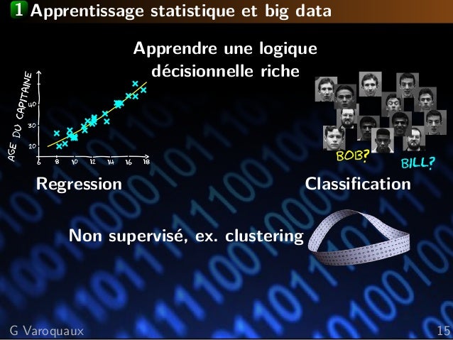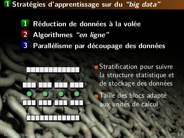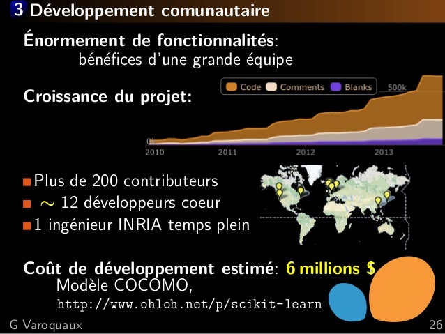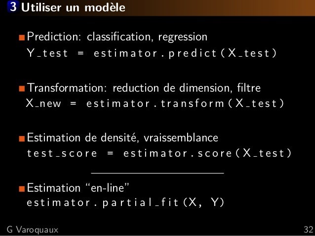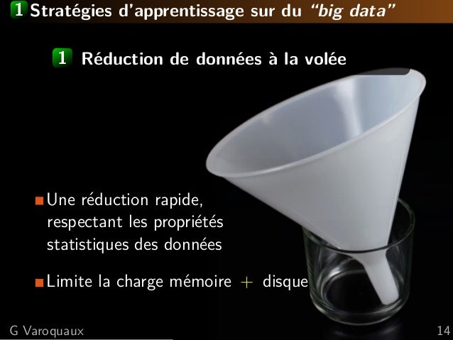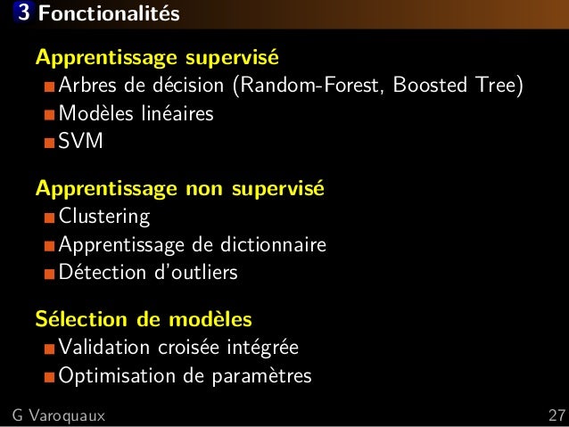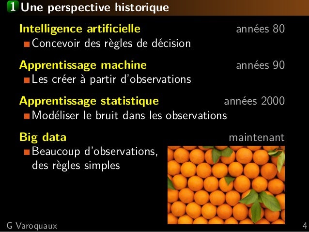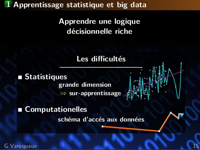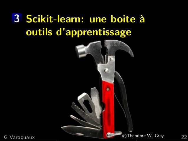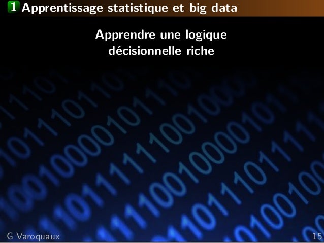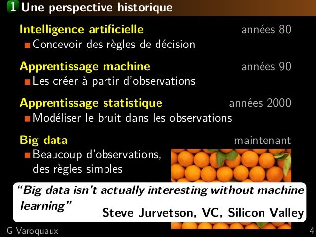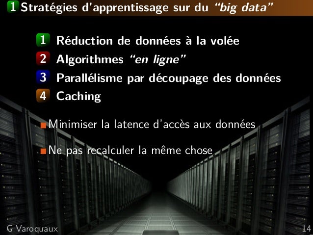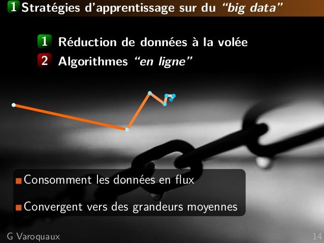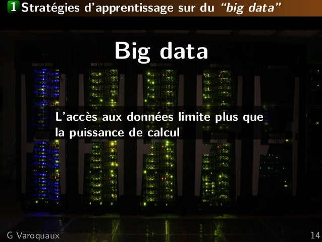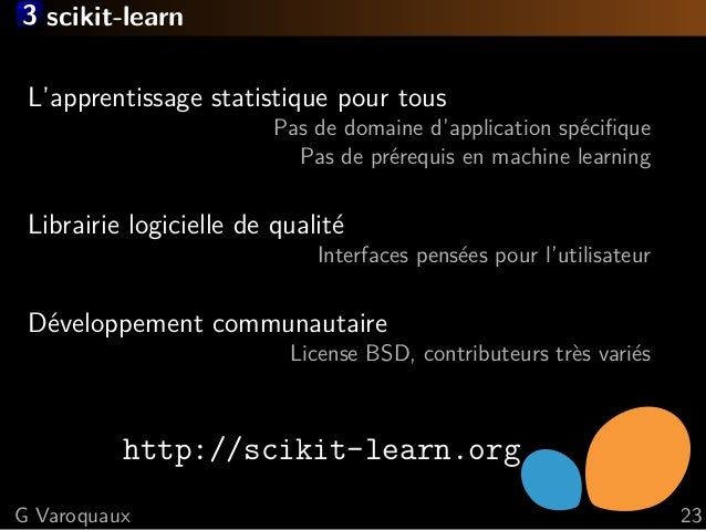 La toolkit OpenSource Scikit-learn s'impose comme comme un standard d'outil pour réaliser des applications d'apprentissage statistique. Nous invitons l'un de ses auteurs et contributeurs, Gaël Varoquaux, chercheur à l'Inria, à venir nous présenter cette toolkit mais également nous proposer une réflexion sur le big data, sur les stratégies et techniques adaptées ou pas selon les contextes et sur les bonnes pratiques issues de son expérience de chercheur en informatique dans un contexte de recherche scientifique en neurosciences ou les données sont réellement BIG et les problèmes de passage à l'echelle particulièrement sévères. Au delà des aspects techniques liés à la toolkit scikit-learn c'est à une session interactive d'échanges avec Gaël Varoquaux que nous vous invitons, et ce autour du thème des techniques d'apprentissage statistique qui introduisent un nouveau paradigme dans le développement d'application sur de grosses masses de données et sur "l'intelligence des données". Car comme aime à le citer Gaël Varoquaux, selon Steve Jurvetson, VC dans la Silicon Valley, "Big Data isn't actually interesting without Machine Learning". Pour en savoir plus: http://scikit-learn.org/stable/index.html http://gael-varoquaux.info/