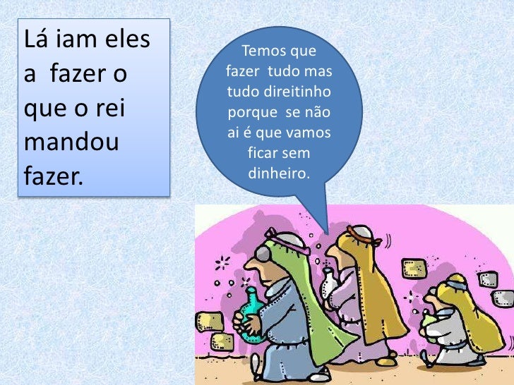 9. 9. Lá iam eles Temos quea fazer o fazer tudo mas tudo direitinhoque o rei porque se não ai é que vamosmandou ficar semfazer. dinheiro.
