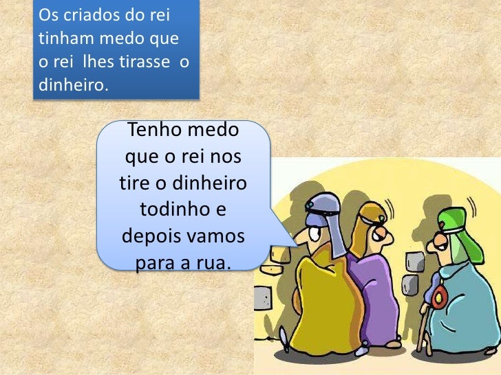 6. 6. Os criados do reitinham medo queo rei lhes tirasse odinheiro. Tenho medo que o rei nos tire o dinheiro todinho e depois vamos para a rua.