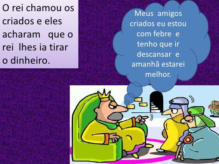 7. 7. O rei chamou os Meus amigoscriados e eles criados eu estouacharam que o com febre erei lhes ia tirar tenho que ir descansar eo dinheiro. amanhã estarei melhor.