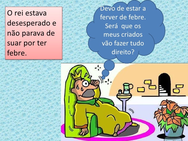 Devo de estar aO rei estava    ferver de febre.desesperado e     Será que osnão parava de    meus criadossuar por ter     ...
