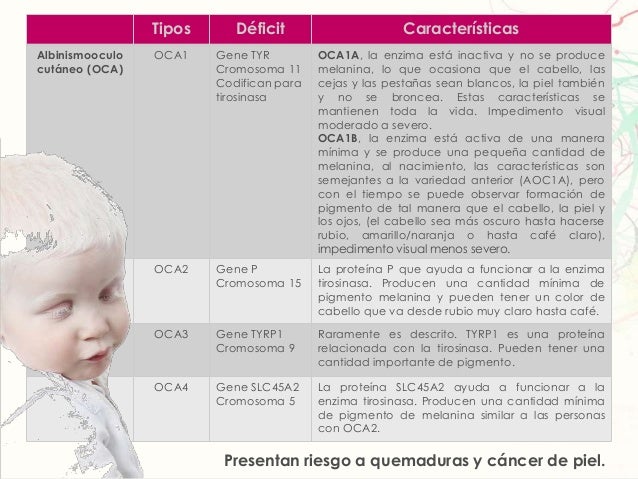 Tipos Déficit CaracterísticasAlbinismooculocutáneo (OCA)OCA1 Gene TYRCromosoma 11Codifican paratirosinasaOCA1A, la enzima ...