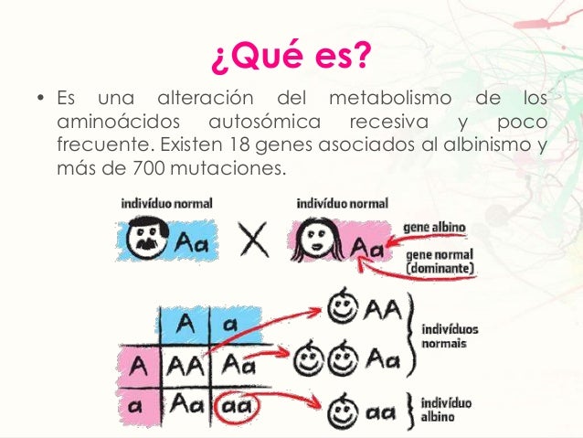 3. 3. ¿Qué es?• Es una alteración del metabolismo de losaminoácidos autosómica recesiva y pocofrecuente. Existen 18 genes asociados al albinismo ymás de 700 mutaciones.
