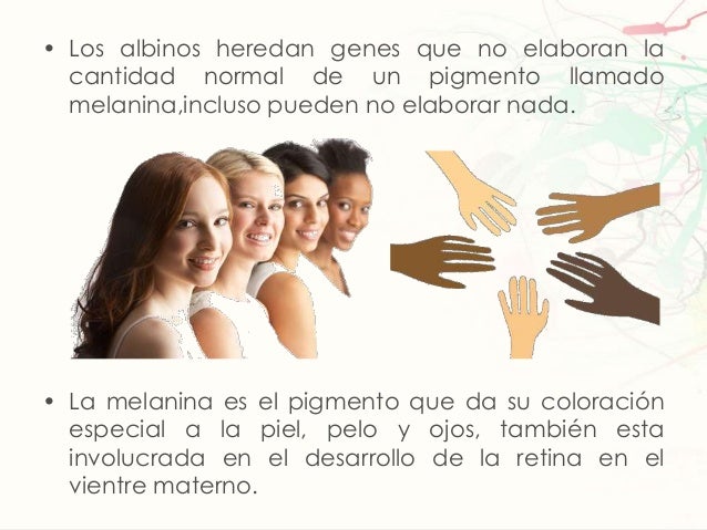 • Los albinos heredan genes que no elaboran lacantidad normal de un pigmento llamadomelanina,incluso pueden no elaborar na...