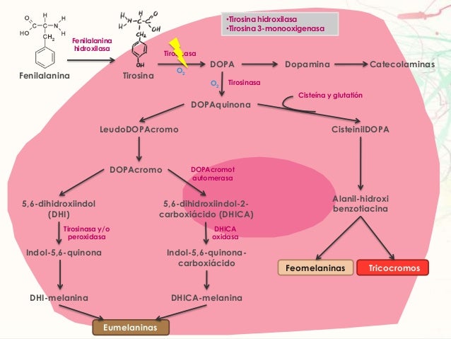 MelanogénesisFenilalanina TirosinaDOPA DopaminaDOPAquinonaCisteinilDOPACatecolaminasLeudoDOPAcromoDOPAcromo5,6-dihidroxiin...