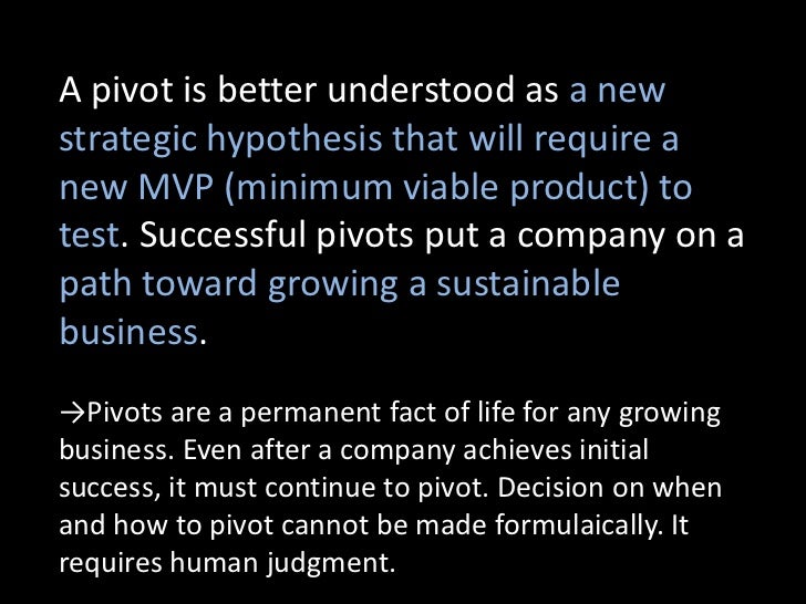 4. 4. A pivot is better understood as a newstrategic hypothesis that will require anew MVP (minimum viable product) totest. Successful pivots put a company on apath toward growing a sustainablebusiness.→Pivots are a permanent fact of life for any growingbusiness. Even after a company achieves initialsuccess, it must continue to pivot. Decision on whenand how to pivot cannot be made formulaically. Itrequires human judgment.