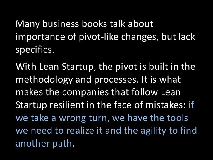 6. 6. Many business books talk aboutimportance of pivot-like changes, but lackspecifics.With Lean Startup, the pivot is built in themethodology and processes. It is whatmakes the companies that follow LeanStartup resilient in the face of mistakes: ifwe take a wrong turn, we have the toolswe need to realize it and the agility to findanother path.