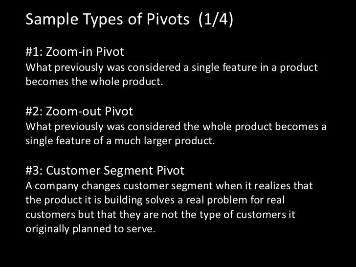 7. 7. Sample Types of Pivots (1/4)#1: Zoom-in PivotWhat previously was considered a single feature in a productbecomes the whole product.#2: Zoom-out PivotWhat previously was considered the whole product becomes asingle feature of a much larger product.#3: Customer Segment PivotA company changes customer segment when it realizes thatthe product it is building solves a real problem for realcustomers but that they are not the type of customers itoriginally planned to serve.