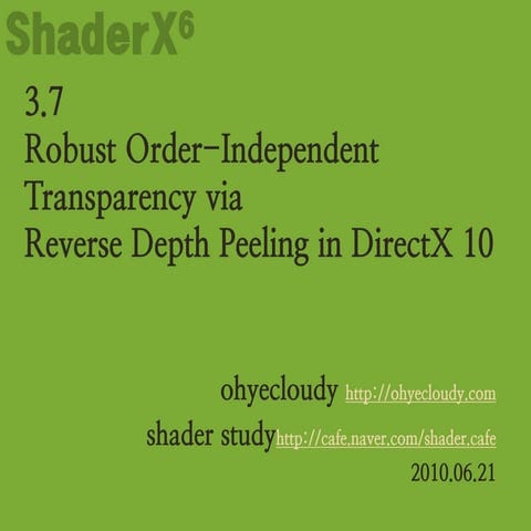 23. 23. Weighted algorithms (I) <ul><li>Meshkin in 2007 proposed an algorithm which is based on the expansion of the alpha blendequation. </li></ul><ul><li>Isolating and discarding the terms which are order dependent, the equation obviously becomes order independent </li></ul><ul><ul><li>dst_color = </li></ul></ul><ul><ul><li>Σ (src_alpha * src_color) </li></ul></ul><ul><ul><li>+ background_color * (1 – Σ (src_alpha)) </li></ul></ul><ul><li>This method is fast (one geometry pass and one render on a quad), but for alpha values greater than 0.25 it tends to darken the image too much </li></ul>