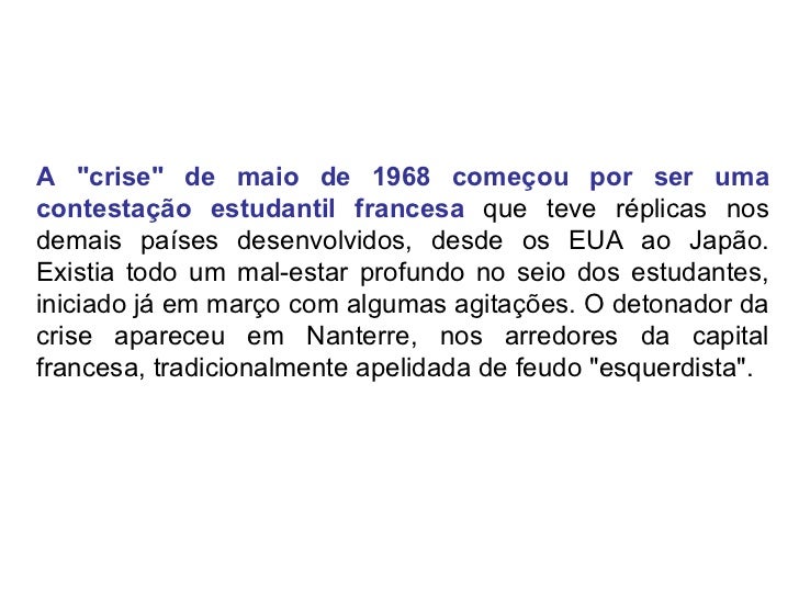 2. 2. A "crise" de maio de 1968 começou por ser uma contestação estudantil francesa que teve réplicas nos demais países desenvolvidos, desde os EUA ao Japão. Existia todo um mal-estar profundo no seio dos estudantes, iniciado já em março com algumas agitações. O detonador da crise apareceu em Nanterre, nos arredores da capital francesa, tradicionalmente apelidada de feudo "esquerdista".