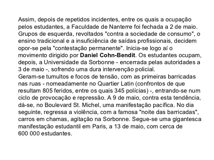 3. 3. Assim, depois de repetidos incidentes, entre os quais a ocupação pelos estudantes, a Faculdade de Nanterre foi fechada a 2 de maio. Grupos de esquerda, revoltados "contra a sociedade de consumo", o ensino tradicional e a insuficiência de saídas profissionais, decidem opor-se pela "contestação permanente". Inicia-se logo aí o movimento dirigido por Daniel Cohn-Bendit . Os estudantes ocupam, depois, a Universidade da Sorbonne - encerrada pelas autoridades a 3 de maio -, sofrendo uma dura intervenção policial. Geram-se tumultos e focos de tensão, com as primeiras barricadas nas ruas - nomeadamente no Quartier Latin (confrontos de que resultam 805 feridos, entre os quais 345 polícias) -, entrando-se num ciclo de provocação e repressão. A 9 de maio, contra esta tendência, dá-se, no Boulevard St. Michel, uma manifestação pacífica. No dia seguinte, regressa a violência, com a famosa "noite das barricadas", carros em chamas, agitação na Sorbonne. Segue-se uma gigantesca manifestação estudantil em Paris, a 13 de maio, com cerca de 600 000 estudantes.