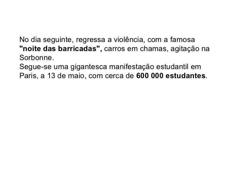 4. 4. No dia seguinte, regressa a violência, com a famosa "noite das barricadas", carros em chamas, agitação na Sorbonne. Segue-se uma gigantesca manifestação estudantil em Paris, a 13 de maio, com cerca de 600 000 estudantes .