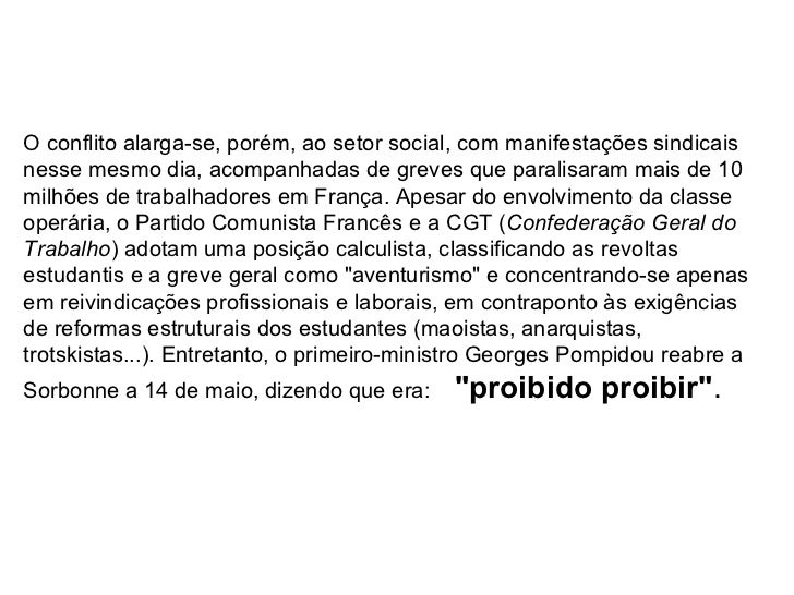 5. 5. O conflito alarga-se, porém, ao setor social, com manifestações sindicais nesse mesmo dia, acompanhadas de greves que paralisaram mais de 10 milhões de trabalhadores em França. Apesar do envolvimento da classe operária, o Partido Comunista Francês e a CGT ( Confederação Geral do Trabalho ) adotam uma posição calculista, classificando as revoltas estudantis e a greve geral como "aventurismo" e concentrando-se apenas em reivindicações profissionais e laborais, em contraponto às exigências de reformas estruturais dos estudantes (maoistas, anarquistas, trotskistas...). Entretanto, o primeiro-ministro Georges Pompidou reabre a Sorbonne a 14 de maio, dizendo que era: "proibido proibir" .