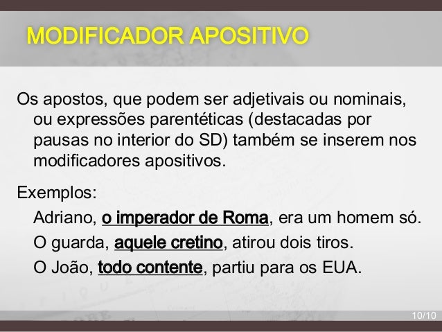 10. 10. MODIFICADOR APOSITIVO Os apostos, que podem ser adjetivais ou nominais, ou expressões parentéticas (destacadas por pausas no interior do SD) também se inserem nos modificadores apositivos. Exemplos: Adriano, o imperador de Roma, era um homem só. O guarda, aquele cretino, atirou dois tiros. O João, todo contente, partiu para os EUA. 10/10