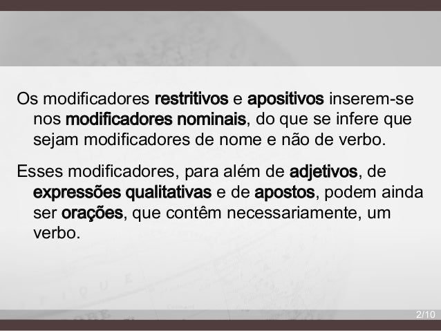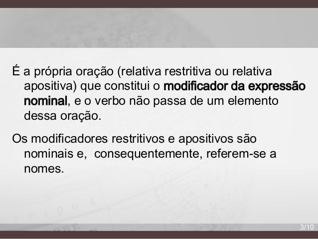 3. 3. É a própria oração (relativa restritiva ou relativa apositiva) que constitui o modificador da expressão nominal, e o verbo não passa de um elemento dessa oração. Os modificadores restritivos e apositivos são nominais e, consequentemente, referem-se a nomes. 3/10
