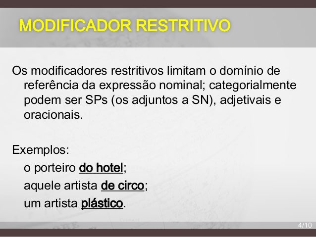4. 4. MODIFICADOR RESTRITIVO Os modificadores restritivos limitam o domínio de referência da expressão nominal; categorialmente podem ser SPs (os adjuntos a SN), adjetivais e oracionais. Exemplos: o porteiro do hotel; aquele artista de circo; um artista plástico. 4/10