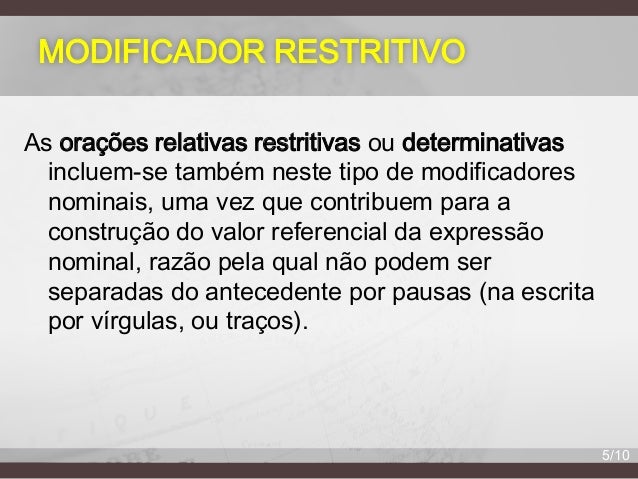 5. 5. MODIFICADOR RESTRITIVO As orações relativas restritivas ou determinativas incluem-se também neste tipo de modificadores nominais, uma vez que contribuem para a construção do valor referencial da expressão nominal, razão pela qual não podem ser separadas do antecedente por pausas (na escrita por vírgulas, ou traços). 5/10