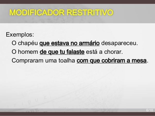6. 6. MODIFICADOR RESTRITIVO Exemplos: O chapéu que estava no armário desapareceu. O homem de que tu falaste está a chorar. Compraram uma toalha com que cobriram a mesa. 6/10